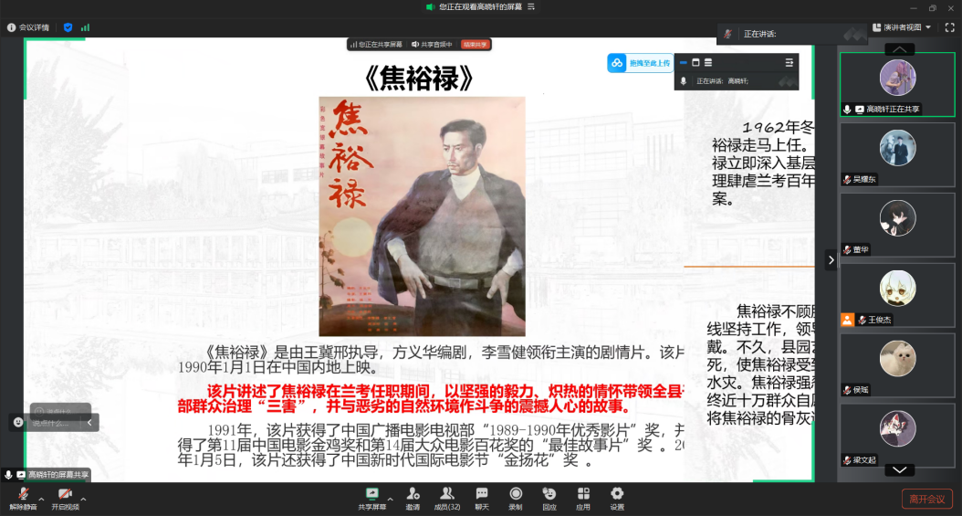 观影前,学生党员高晓轩讲述了焦裕禄艰苦奋斗,鞠躬尽瘁的一生。影片《焦裕禄》以真实历史为蓝本,生动刻画了上世纪60年代县委书记焦裕禄带领兰考人民与风沙、盐碱、内涝“三害”顽强斗争的峥嵘岁月。镜头中,焦裕禄顶风冒雨查风口、探流沙,俯身田间与农民同吃同劳动;他强忍肝癌剧痛坚持工作,深夜雪中探望孤寡老人,一幕幕质朴却震撼的画面,让我们数次潸然泪下。