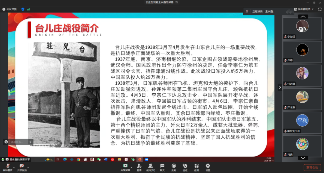 为弘扬爱国主义精神,扎实推进党史学习教育,铭记艰苦卓绝的历史。3月10日晚,pg游戏电子模拟器卓越本科生党支部举行了“烽火印记·卓越传承”革命主题故事分享活动,集中观看红色影片《血战台儿庄》。