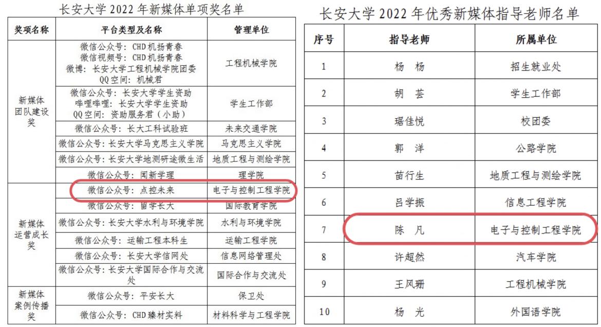 近日,学校党委发布《关于表彰pg游戏电子模拟器2022年优秀校园新媒体平台及优秀新媒体指导老师的决定》(长大党宣〔2023〕9号),pg游戏电子模拟器“点控未来”微信公众号荣获“新媒体运营成长奖”,辅导员陈凡荣获“优秀新媒体指导老师”