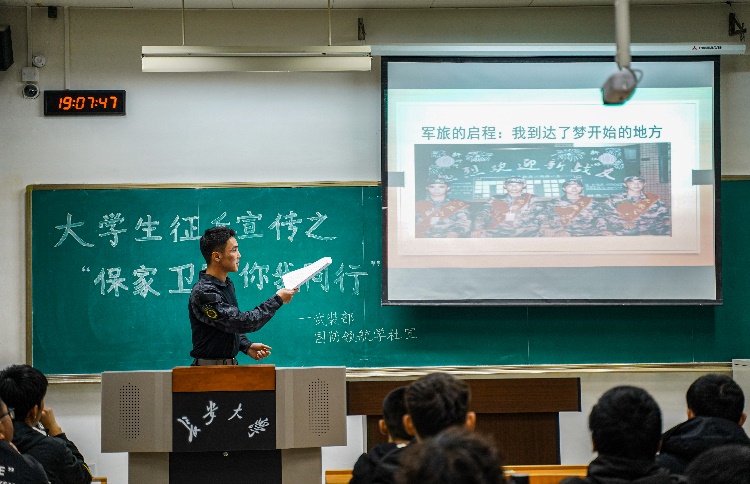 适逢“4·15”全民国家安全教育日,为增强学生对总体国家安全观的认识与理解,同时鼓励pg游戏官网学生积极响应国家号召应征入伍,助力推进国防和军队现代化建设,pg游戏电子模拟器联合我校武装部指导国防领航学社于4月2日在明远WM1309教室开展了以“保家卫国、你我同行”为主题的征兵宣讲活动。本次宣讲活动由pg游戏电子模拟器武装部刘天宇老师指导,武装部弘毅中队成员赵大乐同学主讲,pg游戏电子模拟器本科各年级学生代表和2020级辅导员高朋举老师参加。