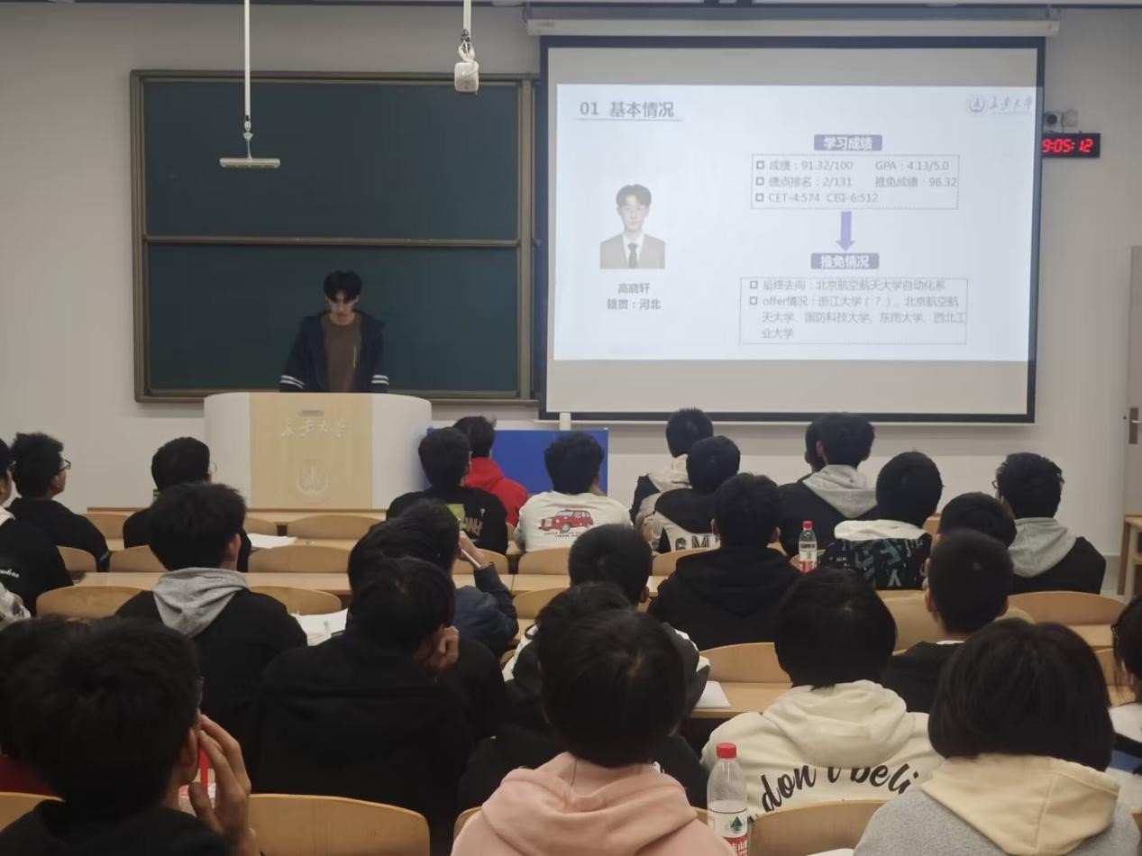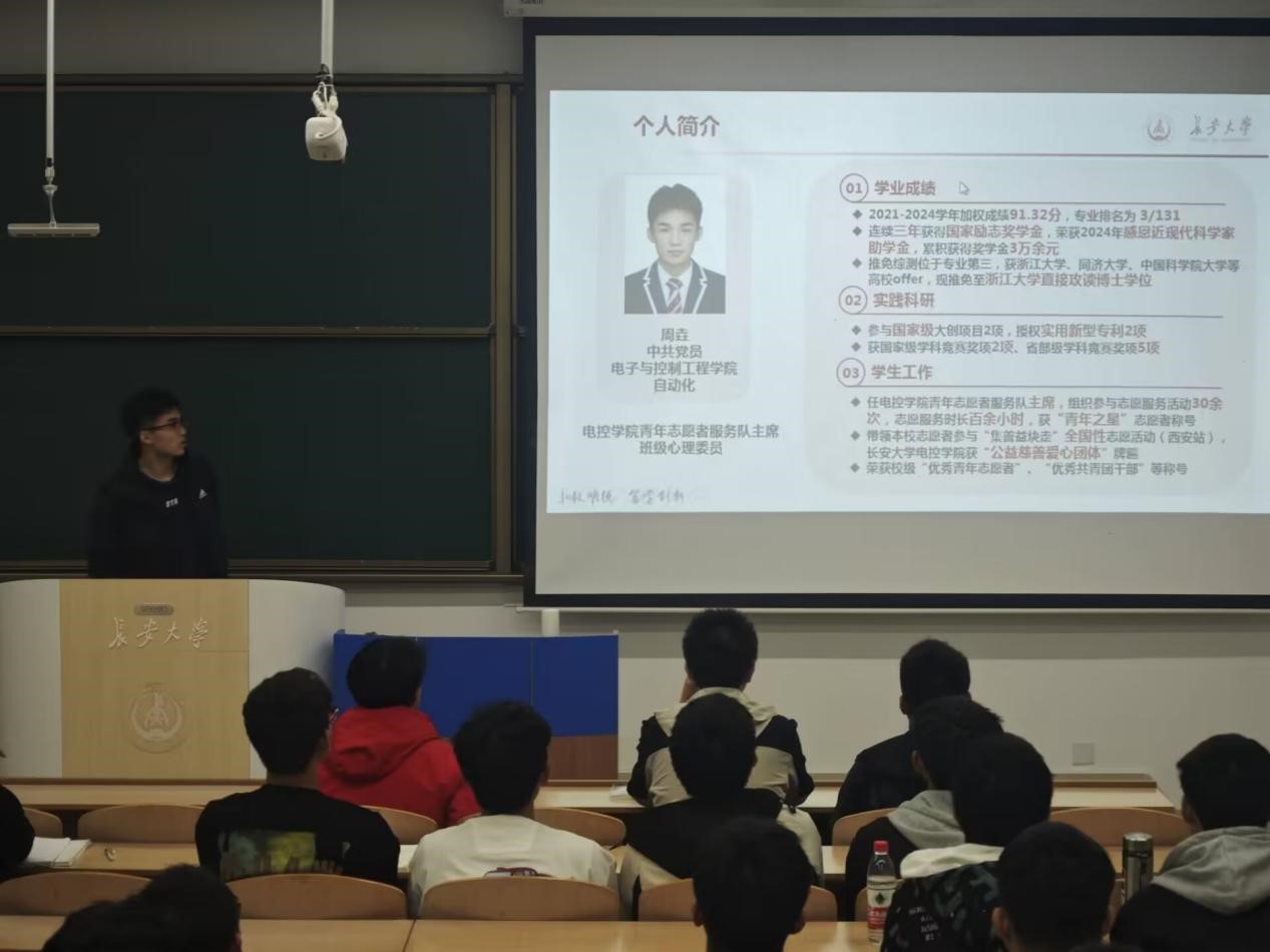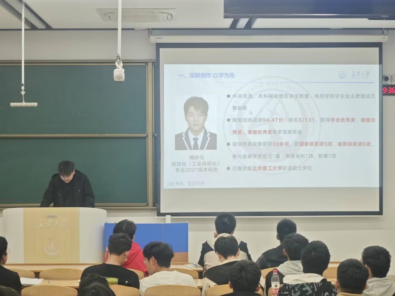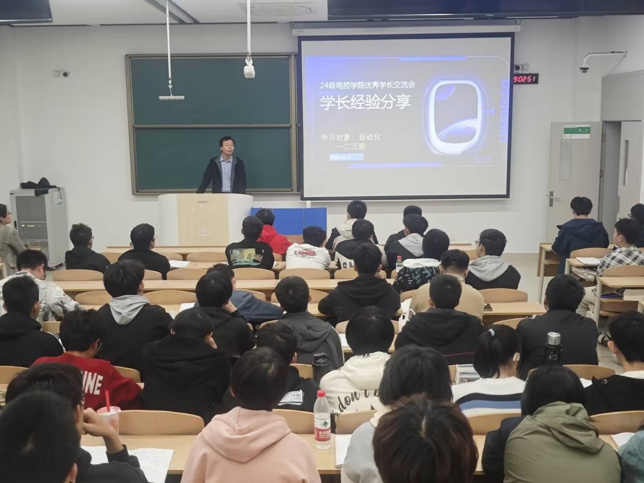 为充分发挥优秀典型的榜样示范作用,营造良好的学习氛围,进一步强化学院学风建设,pg游戏电子模拟器““优秀学长经验交流会”于11月7日晚上19点在WH1101教室召开,会议邀请2021级保研学生高晓轩、楼钟元、周垚作经验分享,2024320101班班主任周经美,2024320101、2024320102、2024320103班全体同学参加会议,会议由自动化系副主任杨盼盼主持。