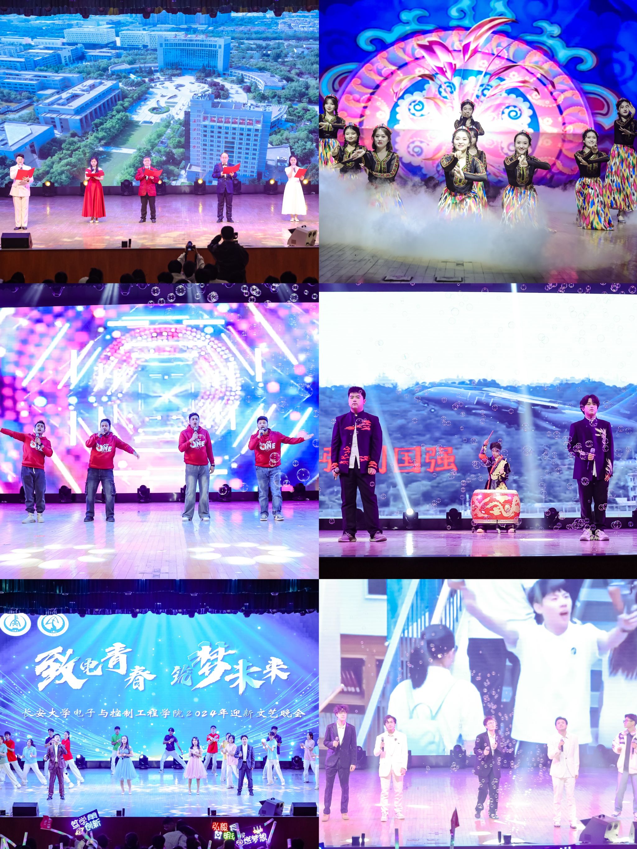 晚会在舞蹈《相亲相爱》中拉开帷幕。歌曲串烧《活力音符》和舞蹈串烧《舞动青春》让人感受到了音符和舞姿所带来的温暖与力量;心理剧《不可“言”说》,讲述了讨好型人格的改变,引人深思、助力心灵成长;舞蹈《雨涧春行图》宛如一幅画卷在舞台上徐徐展开,舞者们的舞步轻盈似梦;乐队歌曲《嘿!姑娘》热情激昂,激励着电控学子奋勇向前;民族舞《丰收》似一幅描绘金秋盛景的油画,用优美的舞姿奏响了对大自然馈赠的感恩赞歌;歌曲《崇拜》《少年中国说》用优美的歌声唱出了对青春的礼赞。校友和在校师生朗诵《青春遇见长大》展现了长大学子对未来的憧憬与期待,回顾新中国75载辉煌,表达了青年们为信仰、梦想出发;全体学生工作干部演唱的歌曲《时间的答案》,表达了对新生的美好祝愿,将晚会氛围推向了高潮。